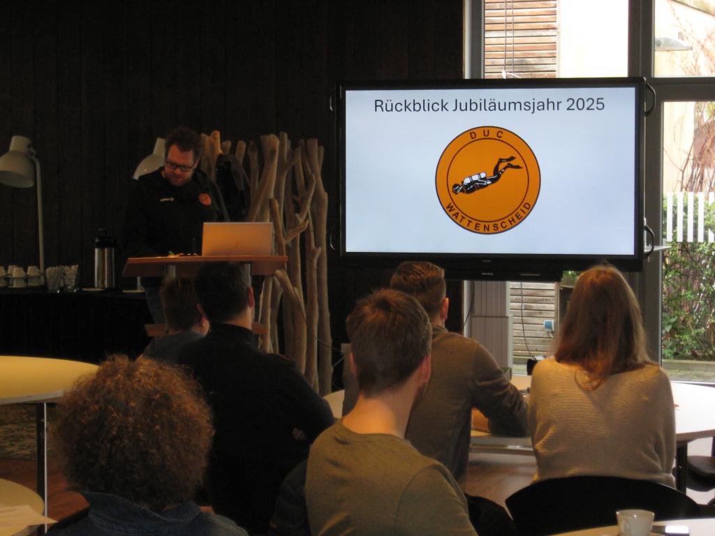 Gemeinsam wurde auf ein erfolgreiches Jubiläumsjahr 2026 zurückgeblickt und die ersten Pläne für dieses Vereinsjahr vorgestellt, wie die Fahrt nach Siegburg oder eine geplante Clubfahrt nach Holland. Als Vertreter der Clubjugend stellt Martin die Umstrukturierung der Schwimmgruppen vor, die sich nun besser nach den Leistungsstand der Teilnehmer*innen richten.