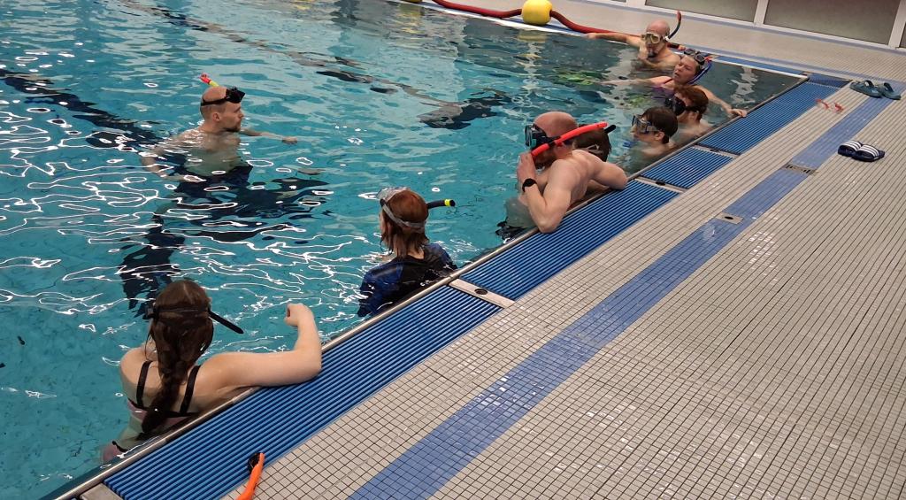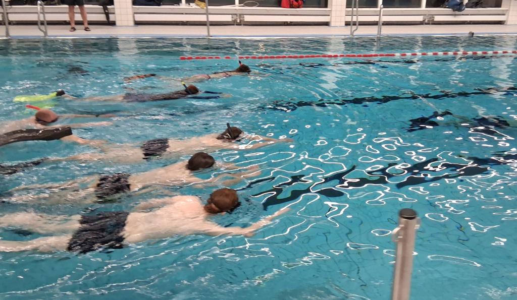 Danach übten wir eine energieeffiziente Wende unter Wasser. Ziel: möglichst elegant drehen, ohne dabei den halben Sauerstoffvorrat zu verbrauchen.