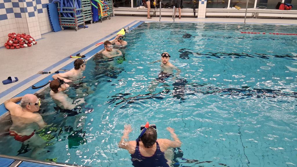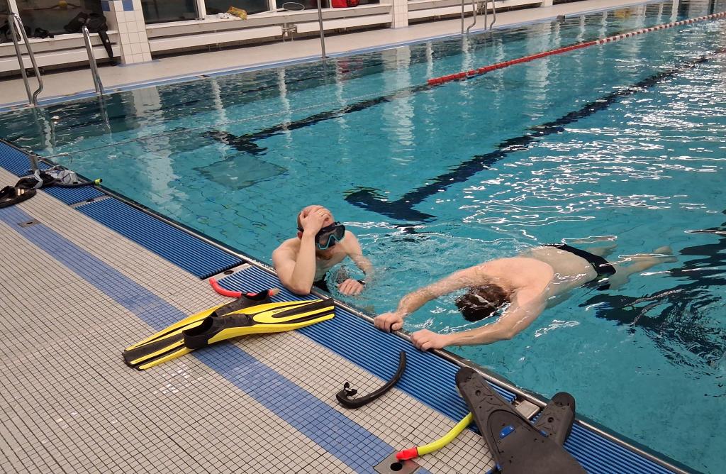 Zum Abschluss gab es noch Streckentauchen durch das Becken, ebenfalls mit Sicherungstaucher. Hier ging es darum, möglichst entspannt und effizient unter Wasser voranzukommen – also eher wie ein ruhiger Delfin als wie ein panisch paddelnder Pinguin.